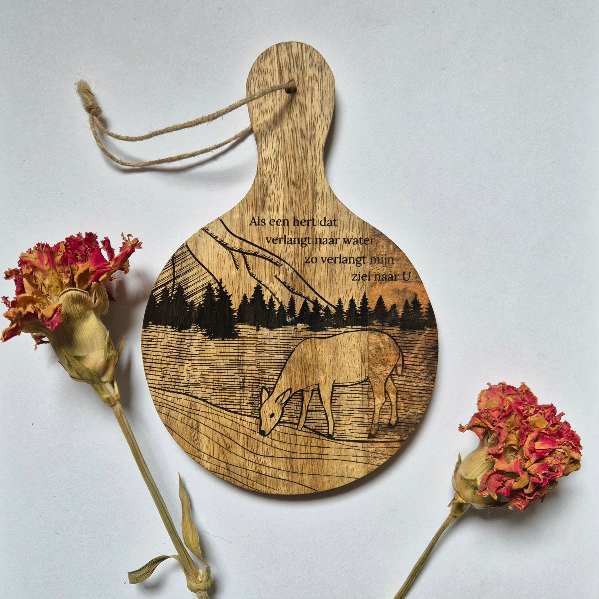 Omdat elk product met de hand wordt ontworpen en met een laser wordt gesneden, kunnen er kleine verschillen zijn in zowel de gravure als de afbeelding. Hout is een natuurlijk materiaal, dus kleur en nerven variëren per stuk. Dit maakt elk item uniek met een eigen, bijzondere uitstraling!